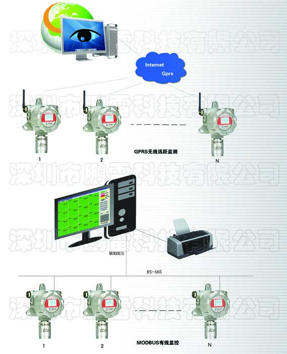 終端集中監控:主要有兩種方式選擇:1) 電腦智能化管理系統,主要功能可實現多點集中控制,系統擴展性不在增加成本方便,可存儲數據,歷史報表,報警記錄,曲線圖等多方位展示濃度的變化。2)氣體控制主機,多用為固定通道巡檢,提供集中報警,各個通道濃度數據的集中監控。